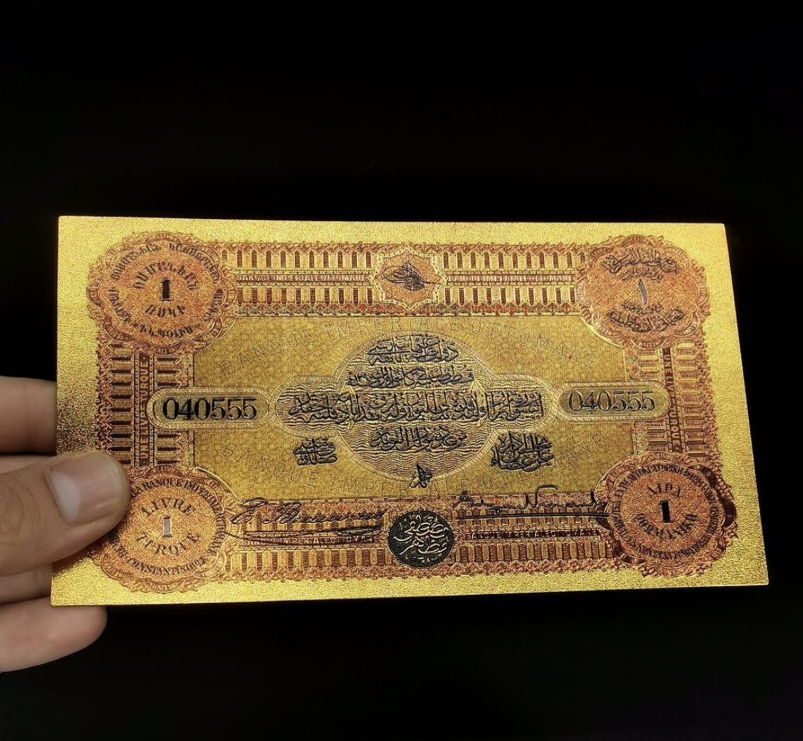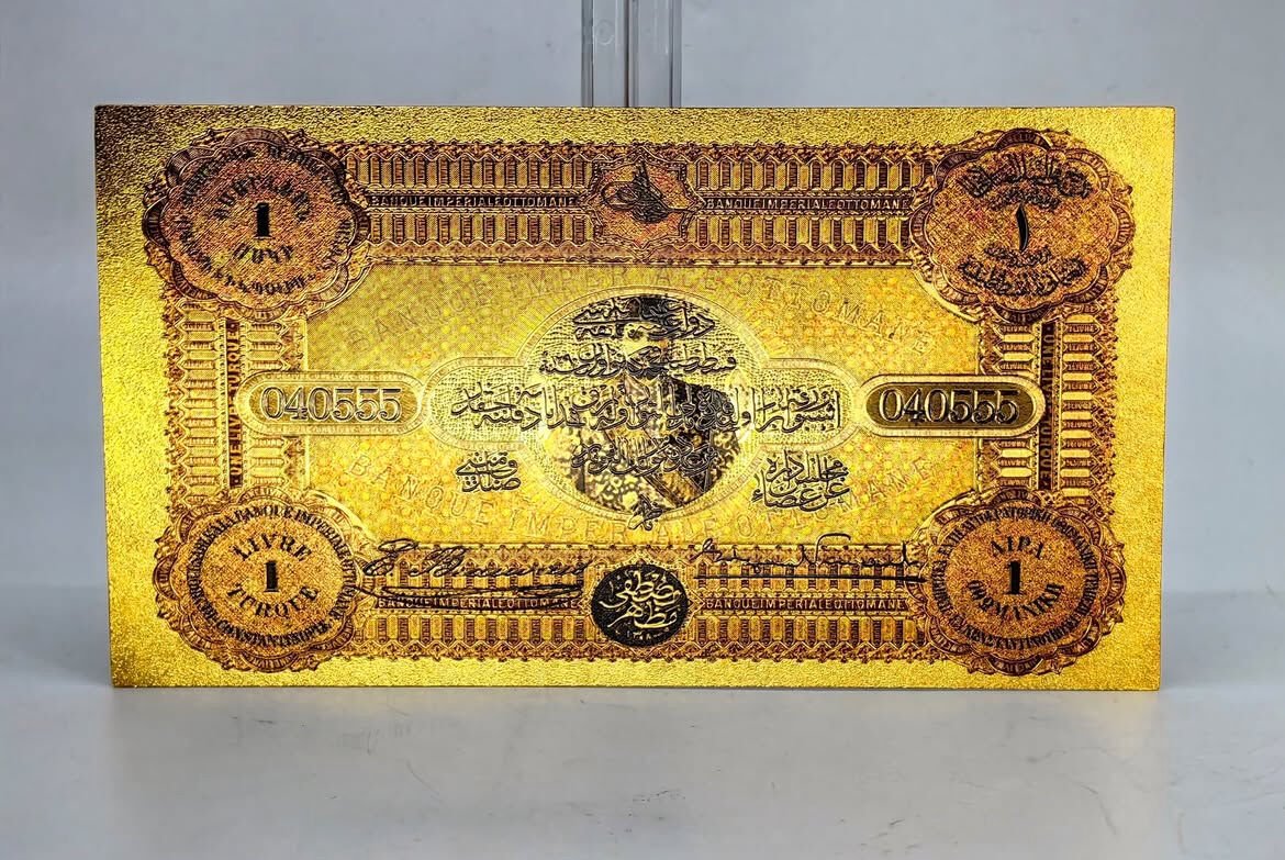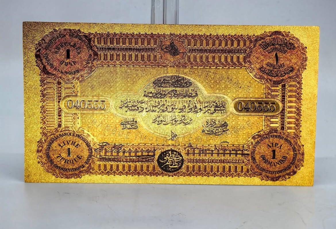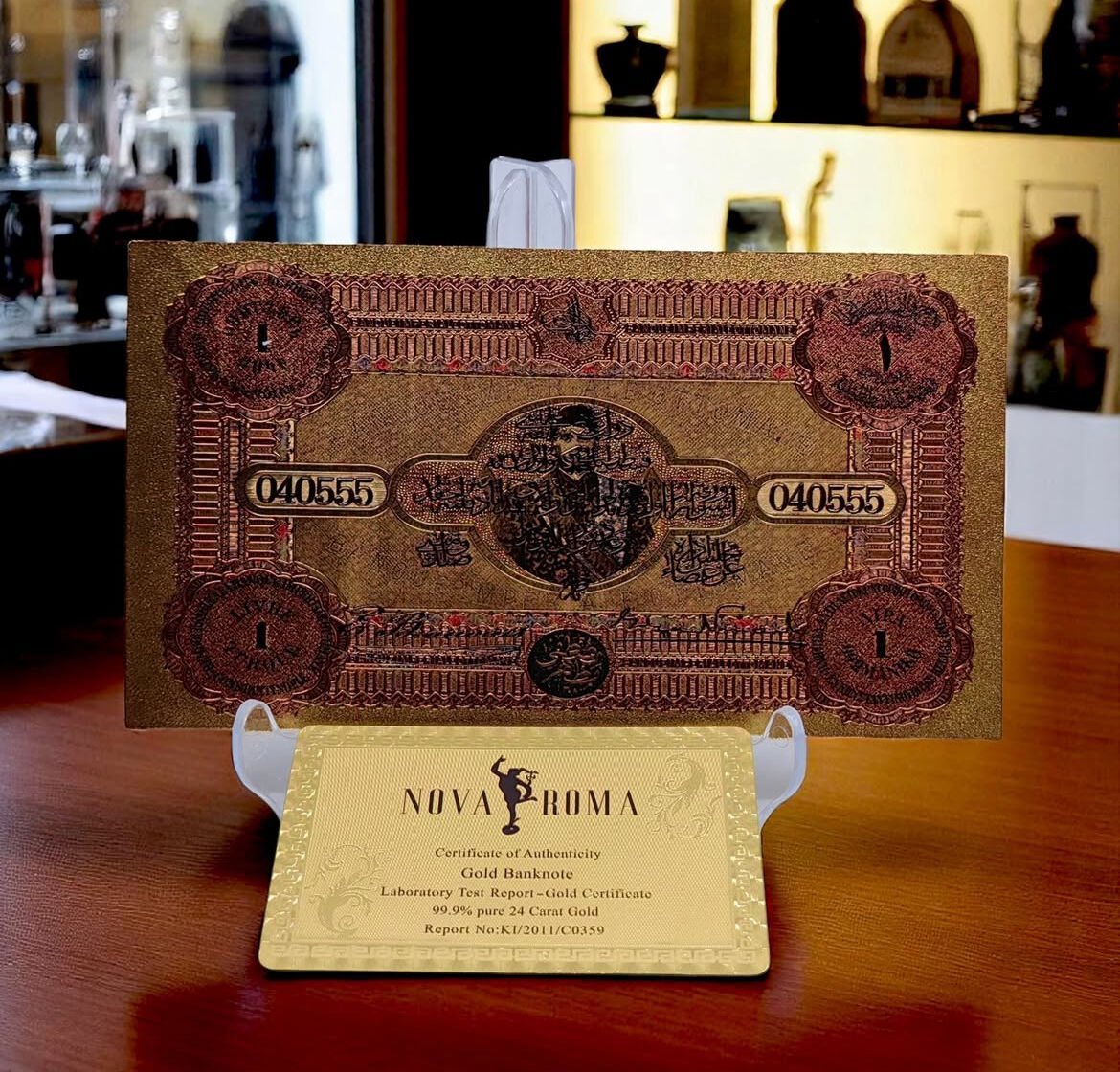 24 Ayar Altın Kaplama Osmanlı Konstantinapolis 1 Livre Hatıra Sertifikalı Banknot