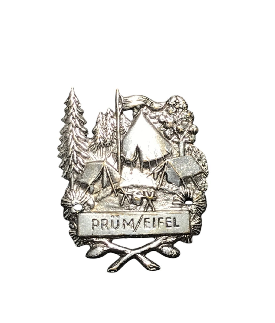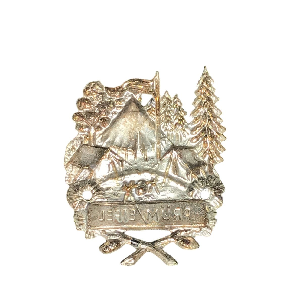 Malzeme ve Teknik: Gümüş kaplama metal alaşım döküm, kabartma işçilikli. Arka yüzü gümüş kaplama, kabartma yazılar (tersten) içerir. Yüzeydeki Temsil: Kamp ve doğa teması. Merkezi bir çadır, etrafında daha küçük çadırlar, bayrak, çam ve yaprak döken ağaçlar. Alt kısımda çapraz yerleştirilmiş kaşıklar ve bir bant üzerinde yer ismi. Menşei: Almanya (Eifel Bölgesi). Dönemi / Tarih: Turistik ve doğa sporları hatırası, 20. yüzyıl ortaları. Tematik / Koleksiyonel Değer: Kampçılık, izcilik veya doğa temalı bölgesel hatıra madalyaları ve rozetleri koleksiyonları için önemlidir. Varsa Önemli İşaretler: Ön yüzündeki bantta: "PRÜM / EIFEL".