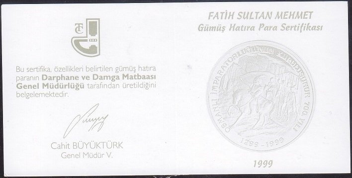 Hatıra Para Sertifikası - Fatih Sultan Mehmet - 1999 Yılı