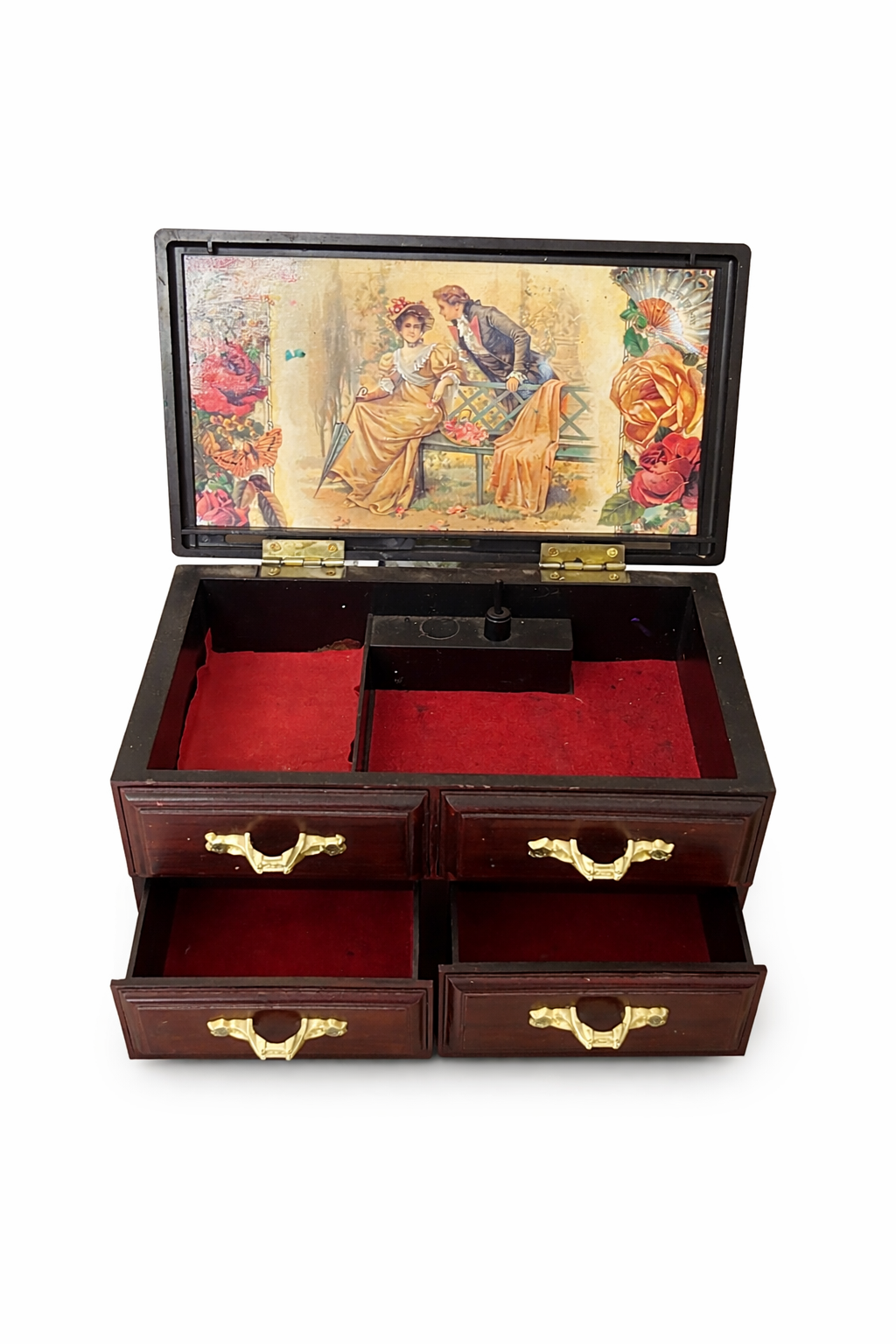 Kapağı açıldığında mekanik laterna sistemi devreye girer (mekanik aksam kısmı üst haznede konumlu). İç bölmeler ve çekmeceler kırmızı kadife kaplıdır; bu hem takılarınızı korur hem de aristokratik bir sunum sağlar.