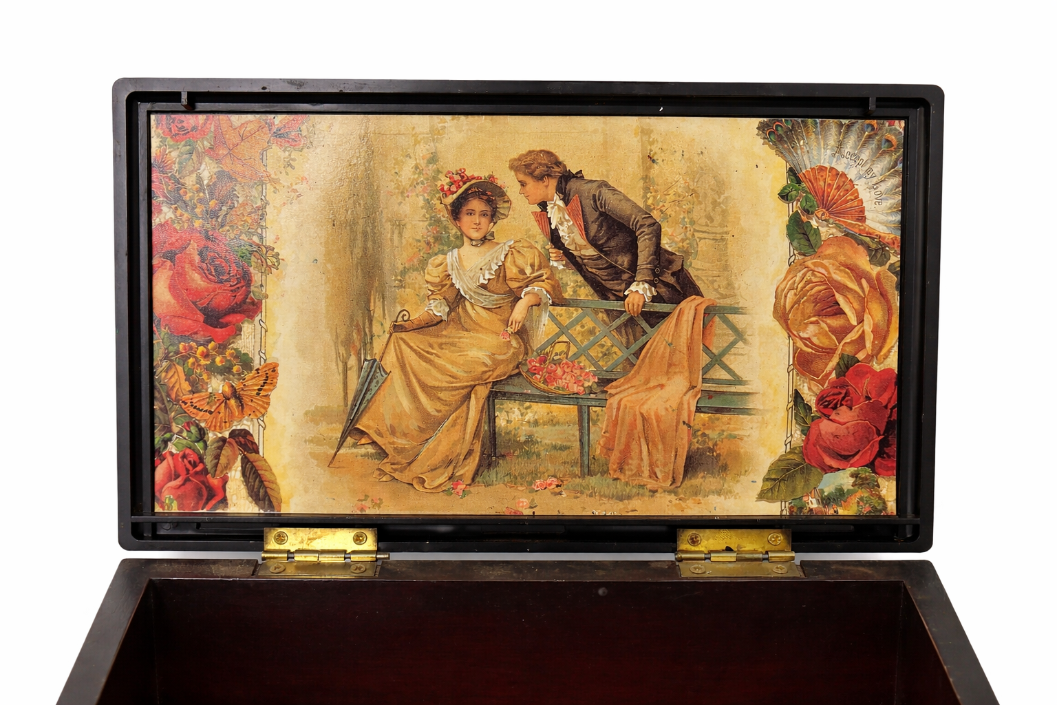 Geçmişin romantik estetiğini günümüze taşıyan bu özel laternalı takı kutusu, hem dekoratif hem de işlevsel bir koleksiyon parçasıdır. Kapak iç yüzeyinde yer alan pastoral sahneli dönem baskı görseli, 19. yüzyıl Avrupa romantizm akımını yansıtan zarif bir kompozisyona sahiptir.