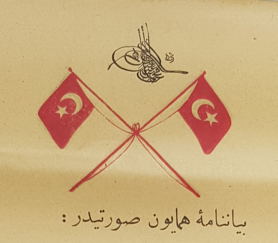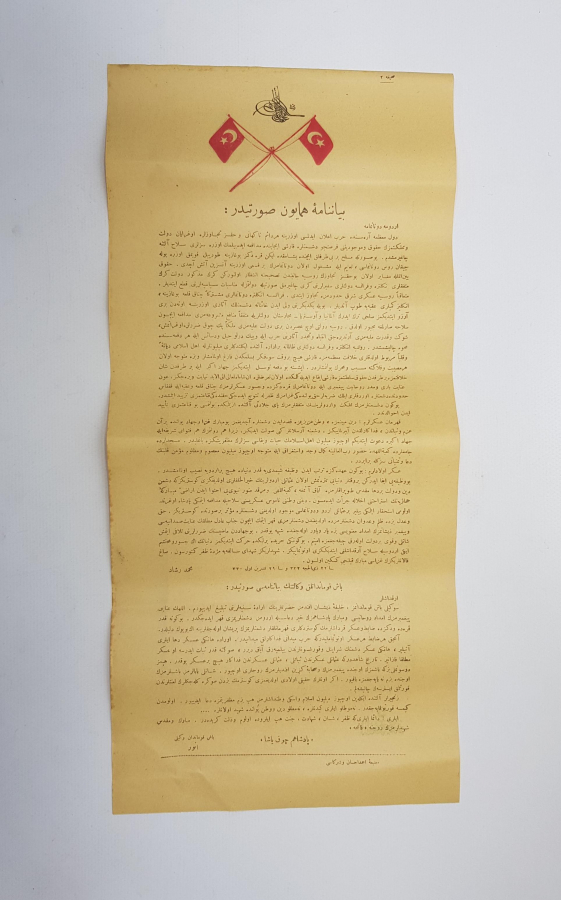 KIRMIZI BAYRAKLI TARAFTA; SULTAN MEHMET REŞAD HAN VE ENVER PAŞA İMZALI SEFERBERLİK İLANI (BEYANNAMEYİ HÜMAYUN)