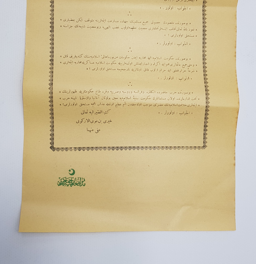 YEŞİL BAYRAKLI TARAFTA İSE ŞEYHÜLİSLAM ÜRGÜPLÜ HAYRİ EFENDİ’NİN VERDİĞİ CİHAD FETVASI (FETVAYI ŞERİF) YER ALMAKTADIR.